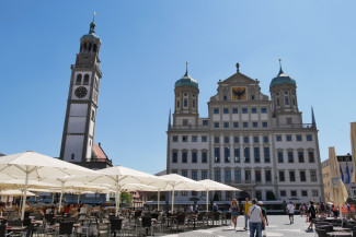 Eine Stadtführung führte vorbei an dem prächtigen, mit dem Wahrzeichen Augsburgs, den Zedernzapfen verzierten Rathaus...
